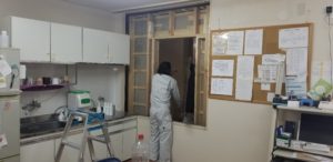 ドアを開け、次亜塩素酸水を噴霧。